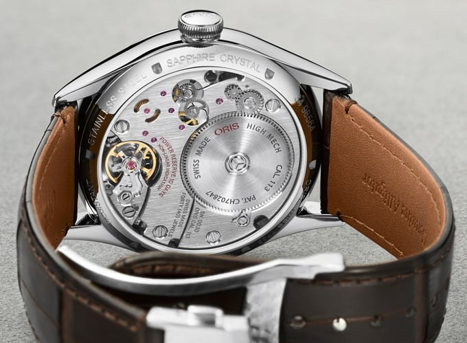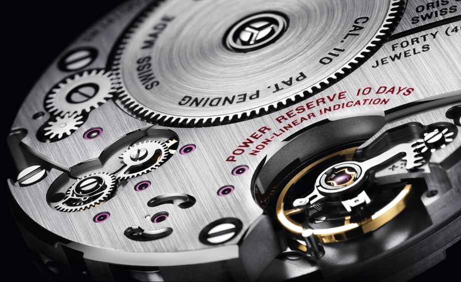 Oris in-house movement calibre 110, introduced in 2014 celebrating Oris's 110th anniversary. Calibre 110 Features a 10 day power reserve with a non-linear power reserve indication.